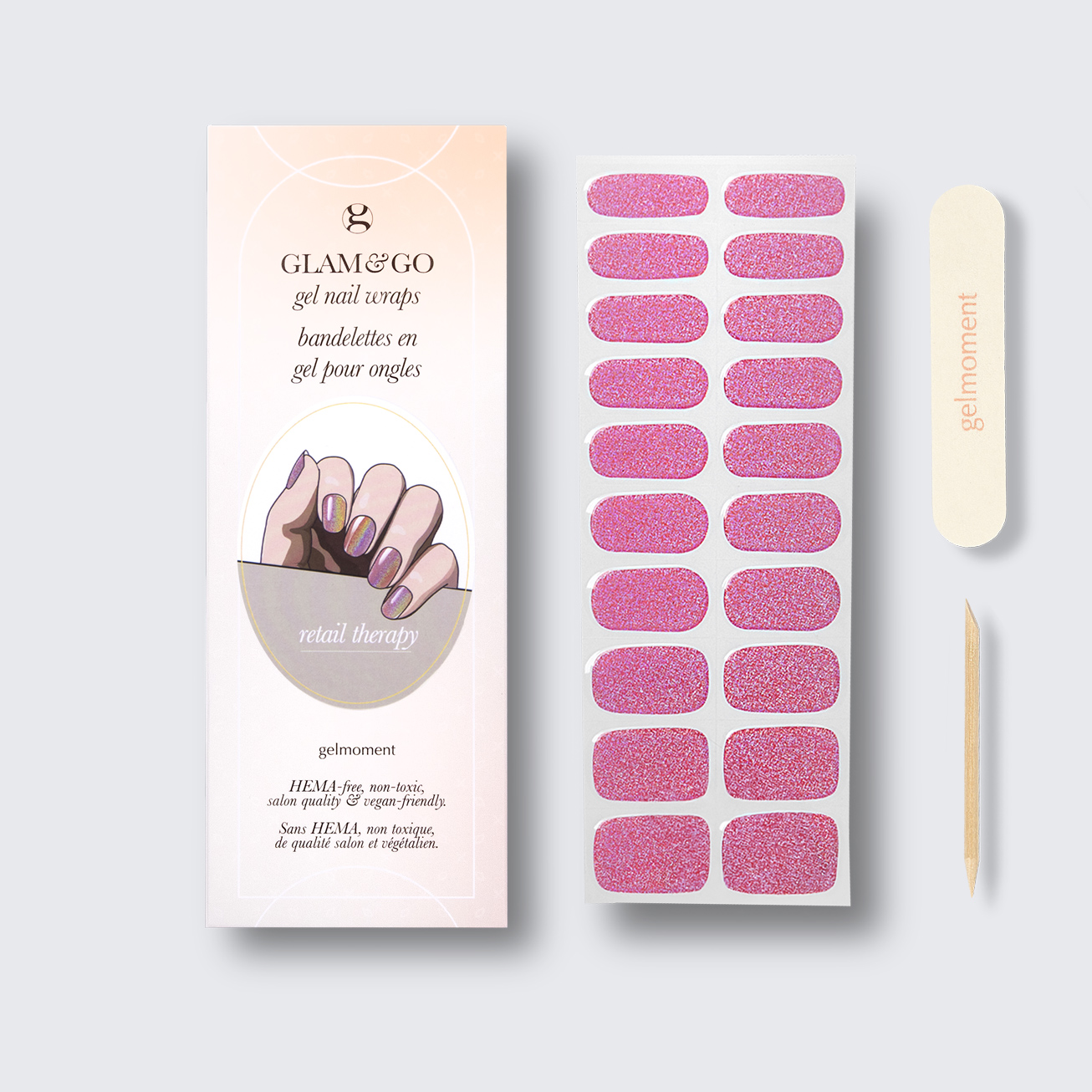 Take a moment to give yourself a head-turning, DIY gelmoment experience in a few easy steps with our GLAM & GO gel nail wraps.