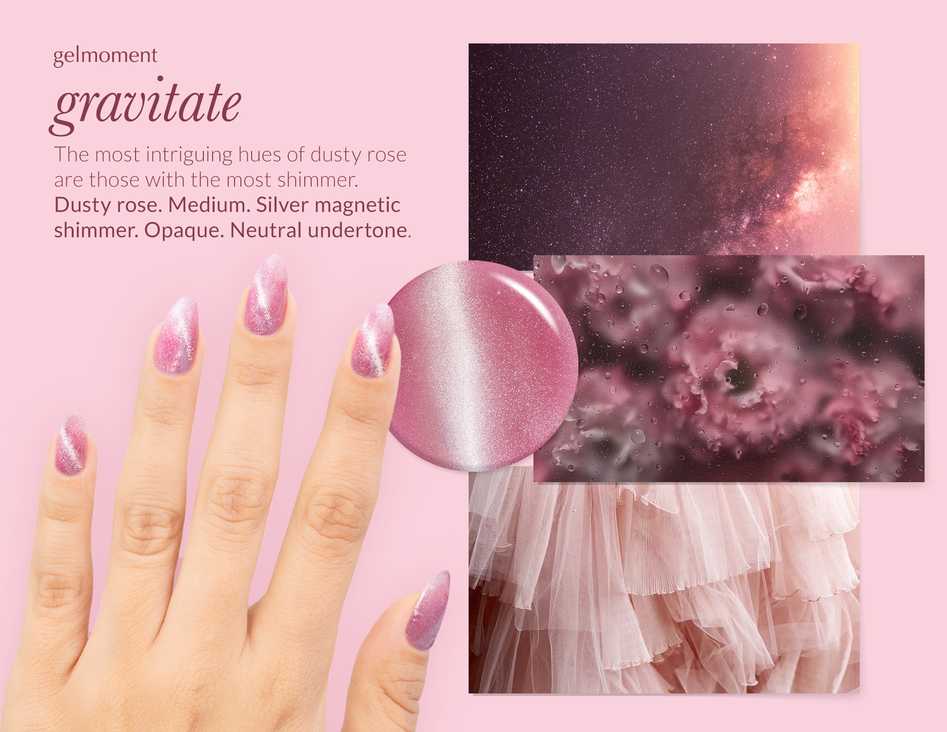 Dusty rose. Medium. Silver magnetic shimmer. Opaque. Neutral undertone.
