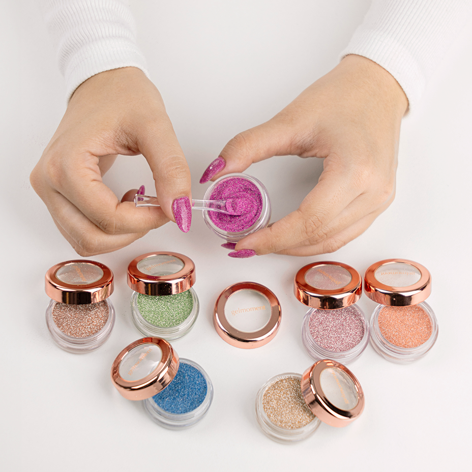 Using the scoop provided, gently pour the shimmer onto the uncured polish.